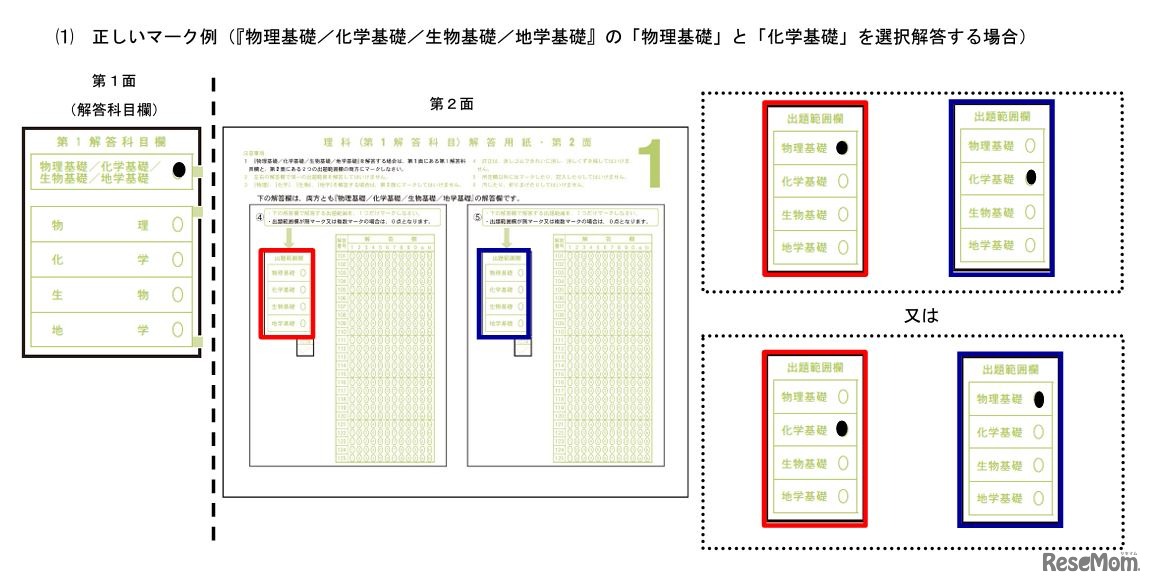 画像出典:大学入試センター「解答科目欄および出題範囲欄の不適切なマーク例」 「理科」の正しいマーク例(「物理基礎/化学基礎/生物基礎/地学基礎」の「物理基礎」と「化学基礎」を選択解答する場合)
