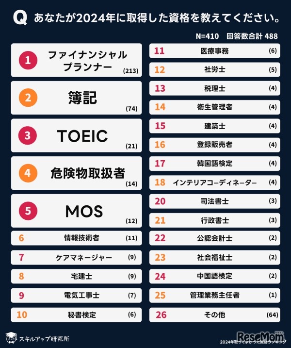 2024年12月7日から12月14日にかけて、学研ホールディングスのグループ会社ベンドが運営する「スキルアップ研究所」は、2024年に資格を取得した全国の人々を対象に「2024年に取得してよかった資格についての調査」をインターネットで実施した。調査の結果、もっとも人気のあった資格はファイナンシャルプランナーであり、取得者の多くが「収入アップ」を目的としていたことが明らかになった。