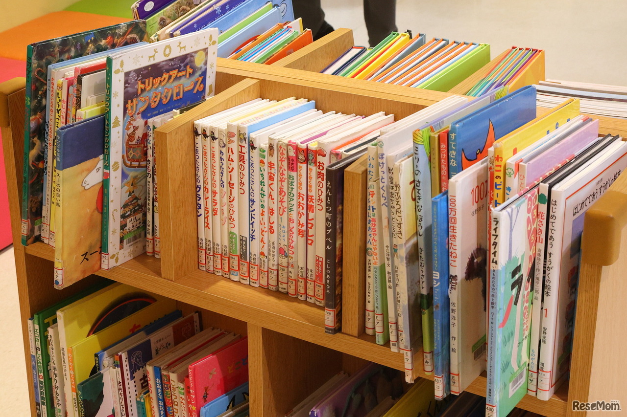 校内の至るところに置かれた本棚には、英語・日本語それぞれの本が並ぶ