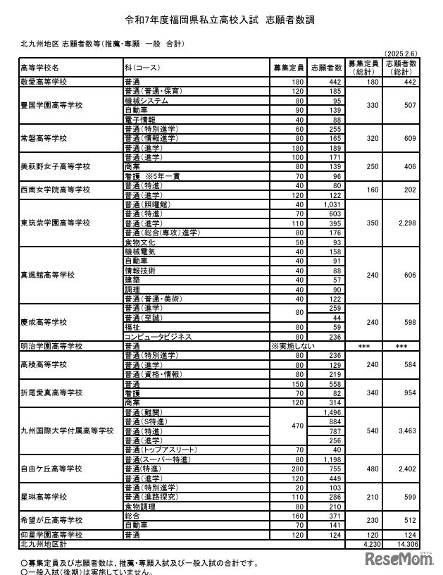 福岡県私学協会は2025年2月6日、2025年度(令和7年度)福岡県私立高校入試における推薦・専願、一般前期の志願者数等を取りまとめて公表した。福岡地区の推薦・専願、一般前期をあわせた私立27校の志願倍率は1.96倍。学校別では福岡大学附属大濠3.31倍がもっとも高かった。