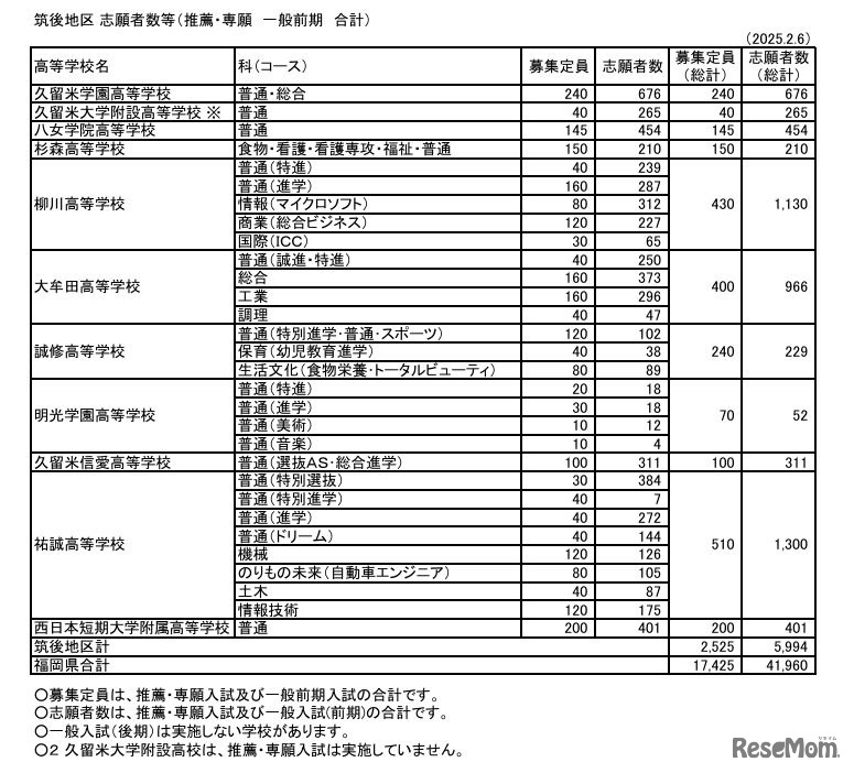 福岡県私学協会は2025年2月6日、2025年度(令和7年度)福岡県私立高校入試における推薦・専願、一般前期の志願者数等を取りまとめて公表した。福岡地区の推薦・専願、一般前期をあわせた私立27校の志願倍率は1.96倍。学校別では福岡大学附属大濠3.31倍がもっとも高かった。