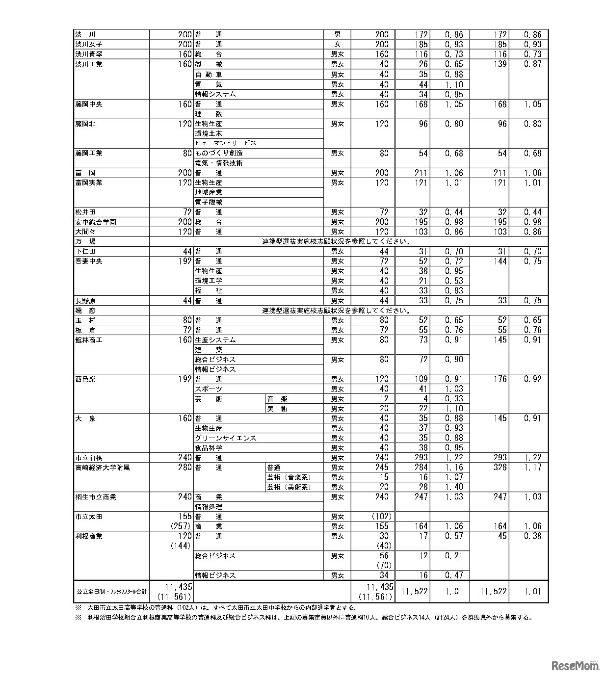群馬県教育委員会は2025年2月7日、2025年度(令和7年度)群馬県公立高等学校入学者選抜における全日制課程・フレックススクール選抜の第1回志願状況を公表した。各学校の志願倍率は、県立前橋(普通)1.12倍、高崎(普通)1.33倍など。