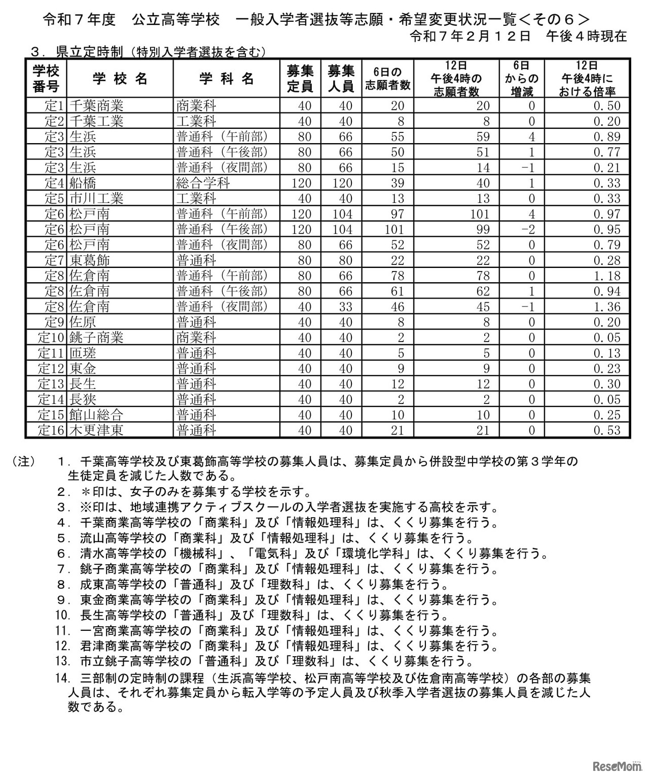千葉県教育委員会は2025年2月12日、2025年度(令和7年度)千葉県公立高等学校入学者選抜について、一般入学者選抜等志願状況を発表した。2月12日午後4時時点の倍率は、東葛飾(普通)2.08倍がもっとも高い。