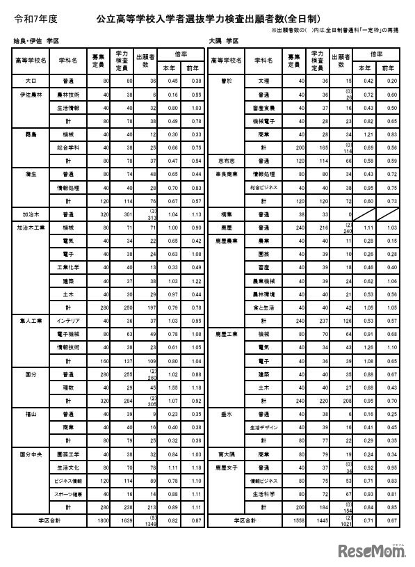 鹿児島県教育委員会は2025年2月14日、2025年度(令和7年度)鹿児島県公立高等学校一般入学者選抜について、学力検査の出願者数を発表した。全日制の出願者数は8,456人で、平均倍率は0.81倍。学校別の出願倍率は、鶴丸(普通)1.44倍、甲南(普通)1.44倍など。