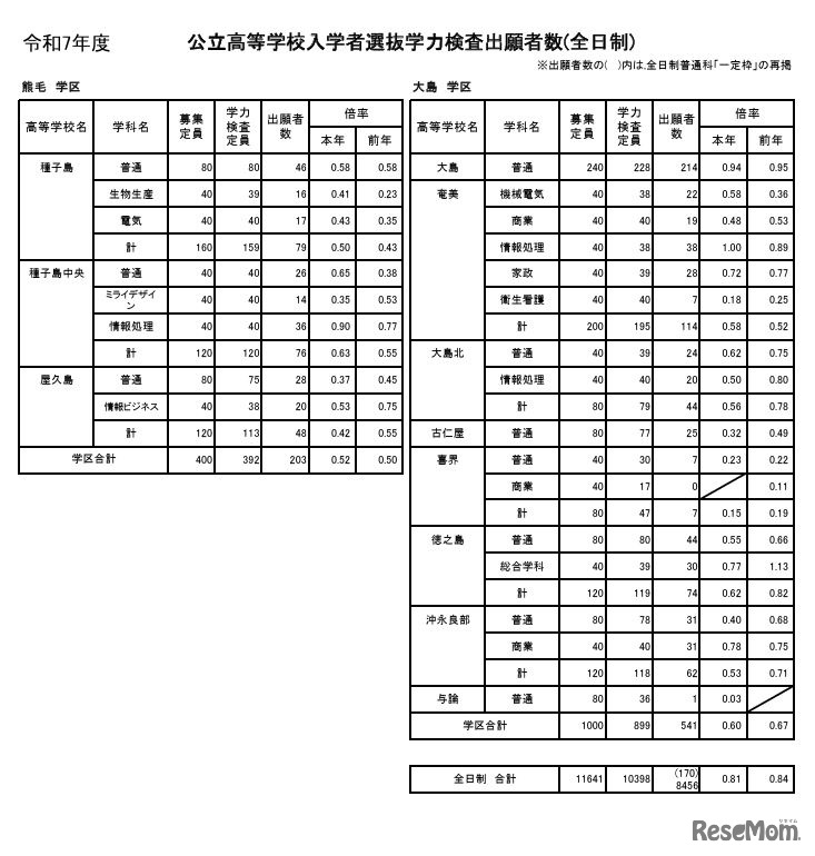 鹿児島県教育委員会は2025年2月14日、2025年度(令和7年度)鹿児島県公立高等学校一般入学者選抜について、学力検査の出願者数を発表した。全日制の出願者数は8,456人で、平均倍率は0.81倍。学校別の出願倍率は、鶴丸(普通)1.44倍、甲南(普通)1.44倍など。