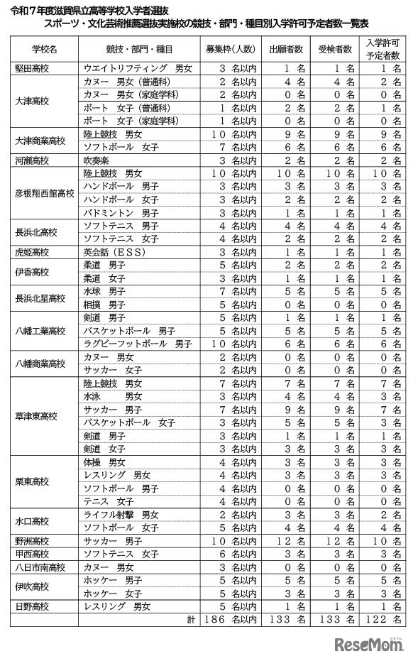 画像出典:滋賀県教育委員会 スポーツ・文化芸術推薦選抜実施校の競技・部門・種目別入学許可予定者数一覧表