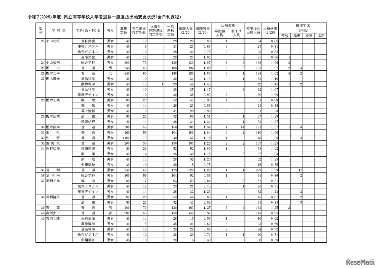 画像出典:栃木県教育委員会 令和7(2025)年度 県立高等学校入学者選抜一般選抜出願変更状況(全日制課程)