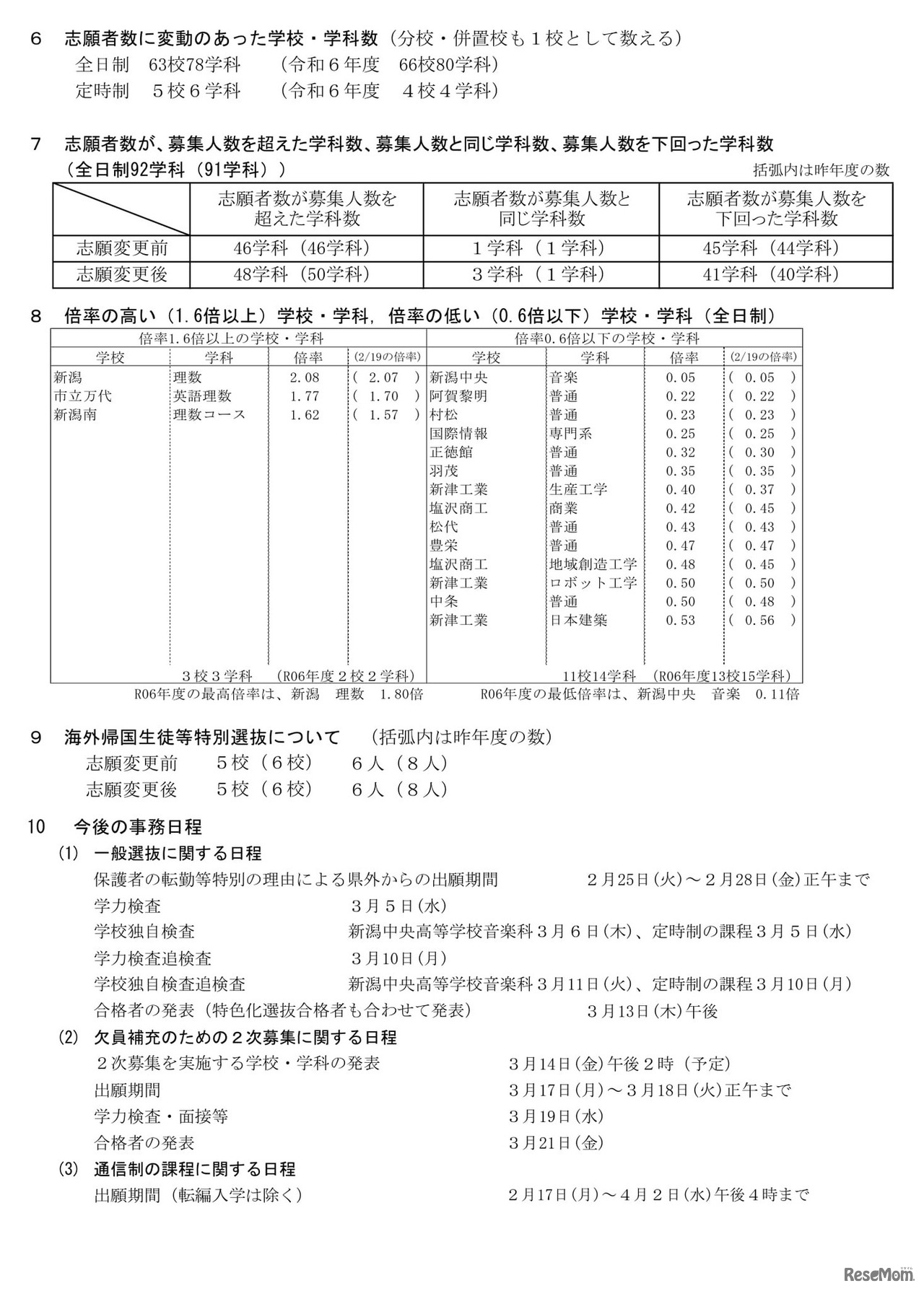 新潟県教育庁は2025年2月27日、2025年度(令和7年度)新潟県公立高校入試における一般選抜の志願変更後の志願状況を発表した。学校別の志願倍率は、新潟(理数)2.08倍、新潟(普通)1.07倍、新潟南(理数コース)1.62倍など。