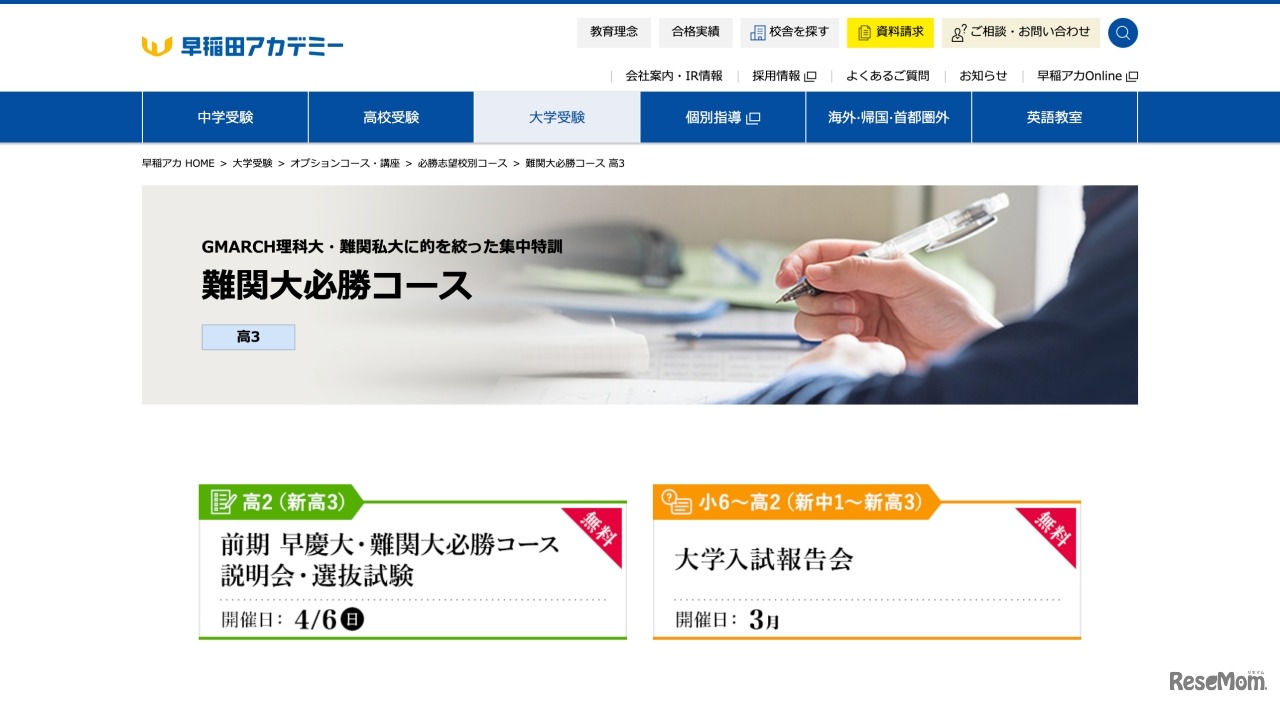 早稲田アカデミーは2025年4月6日、早稲田、慶應義塾などの現役合格を目指す「早慶大必勝コース」および、GMARCHなど難関大の現役合格を目指す「難関大必勝コース」の説明会と選抜試験を開催する。