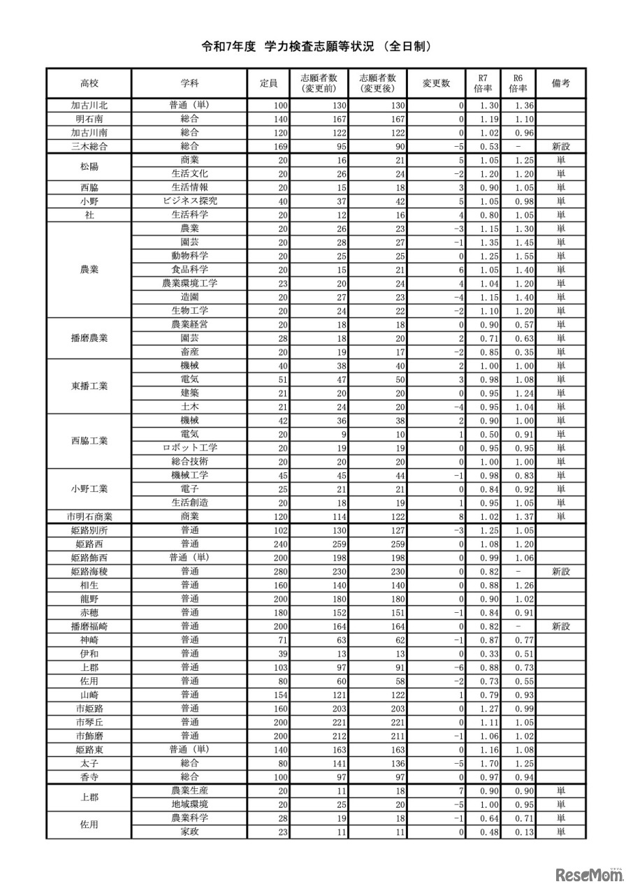 兵庫県教育委員会は2025年3月5日、2025年度(令和7年度)兵庫県公立高等学校入学者選抜の確定出願状況を公表した。全日制の志願者は2万1,596人で、志願倍率は1.02倍。学校・学科別は、神戸(普通)1.16倍、長田(普通)1.15倍、姫路西(普通)1.08倍など。