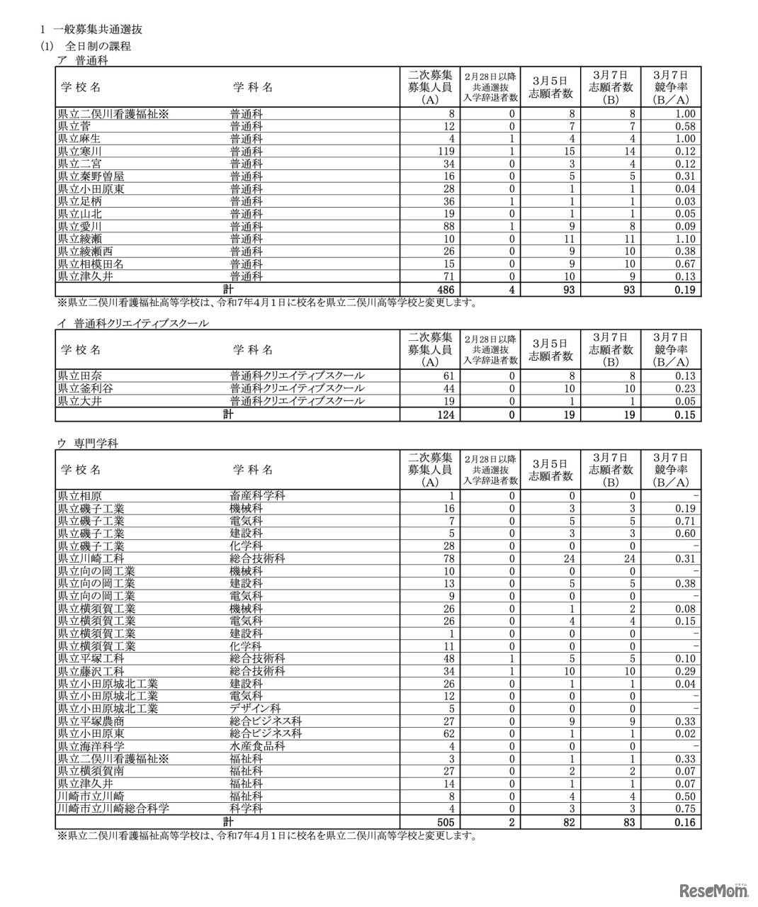 神奈川県教育委員会は2025年3月7日、2025年度(令和7年度)神奈川県公立高等学校入学者選抜2次募集の確定志願状況を発表した。志願変更締切時の共通選抜2次募集の志願倍率は全日制0.19倍、定時制0.17倍。インクルーシブ教育実践推進校特別募集2次募集の志願倍率は0.04倍となった。