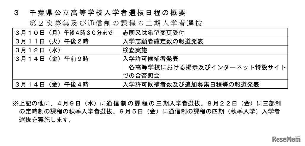 画像出典:千葉県教育委員会 第2次募集と通信制の二期入学者選抜の日程