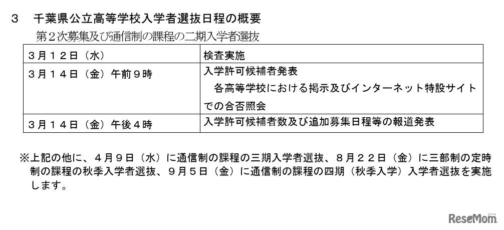 千葉県教育委員会は2025年3月11日、2025年度(令和7年度)千葉県公立高等学校入学者選抜の第2次募集および通信制課程の二期入学者選抜の確定志願状況を発表した。第2次募集の確定志願者数は全日制393人、定時制58人。通信制の二期入学者選抜には27人が志願した。