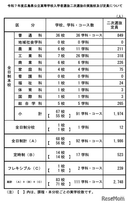 広島県教育委員会は2025年3月12日、2025年度(令和7年度)公立高等学校入学者選抜二次選抜の実施校と定員を発表した。二次選抜実施校は計71校111学科・コース。うち、全日制課程本校は55校91学科・コースで1,974人を募集する。