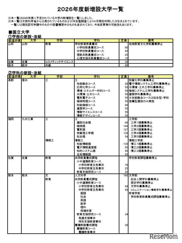 河合塾の大学入試情報サイト「Kei-Net」は2025年4月14日、2026年度入試情報に「新設大学・増設学部・学科一覧」と「入試変更点」の最新情報を掲載した。2026年度は、私立大学7校の新設をはじめ、学習院大学と学習院女子大学の統合、山形大学と長野大学の学部改組などを予定している。