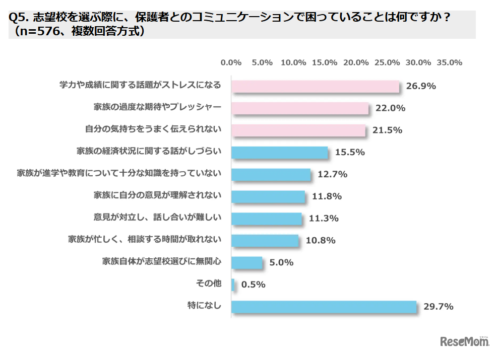 Q5. 志望校を選ぶ際に、保護者とのコミュニケーションで困っていることは何ですか? (n=576、複数回答方式)