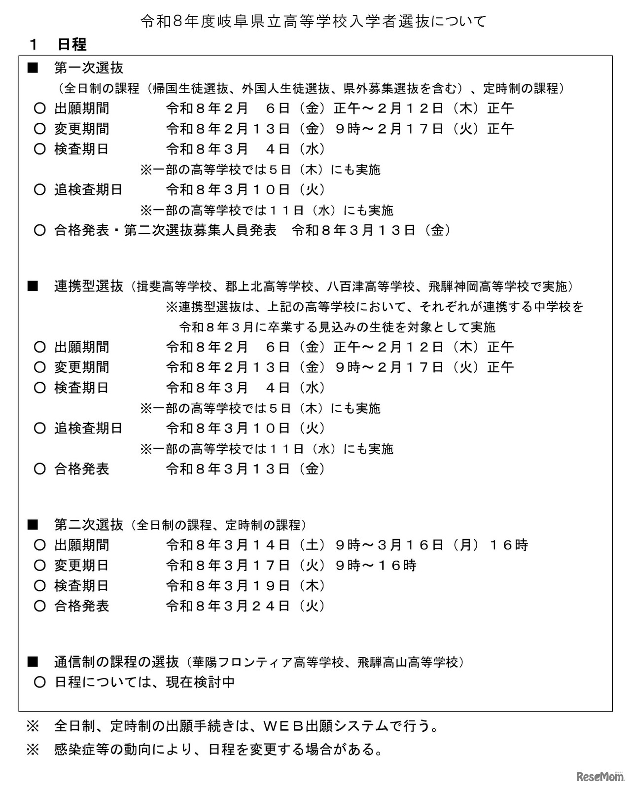 岐阜県教育委員会は2025年4月18日、2026年度(令和8年度)岐阜県立高等学校入学者選抜の日程と概要を発表した。第一次選抜の検査日は2026年3月4日、一部の高校は3月5日にも実施する。出願手続きはWeb出願で行う。