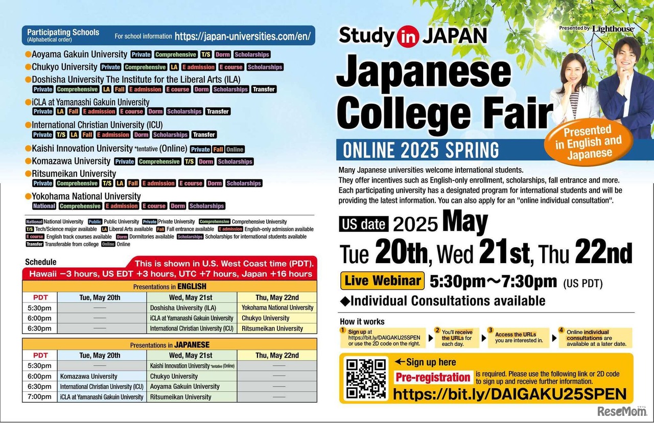 秋入学や英語だけでの入学・卒業が可能など、海外生のための特別な制度をもつ大学が集まる「日本の大学進学フェア」が2025年5月20日~22日(アメリカ西海岸時間、日本時間は+1日)にオンラインで開催される。日本国内からの参加も可。各大学の英語プログラムの最新情報も届けられる。