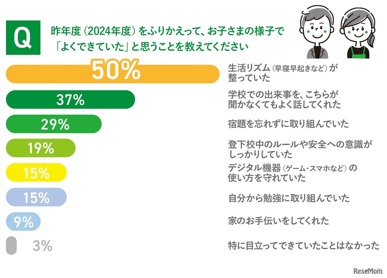 子供の「できた!」と思うこと1位は「学校のことをおうちの人に話した」で49%にのぼる一方で、「できた」と回答した子の親64%が「できていない」と評価していることが2025年5月9日、コクヨの調査結果から明らかとなった。全体では、68%の親子で評価が異なっていた。