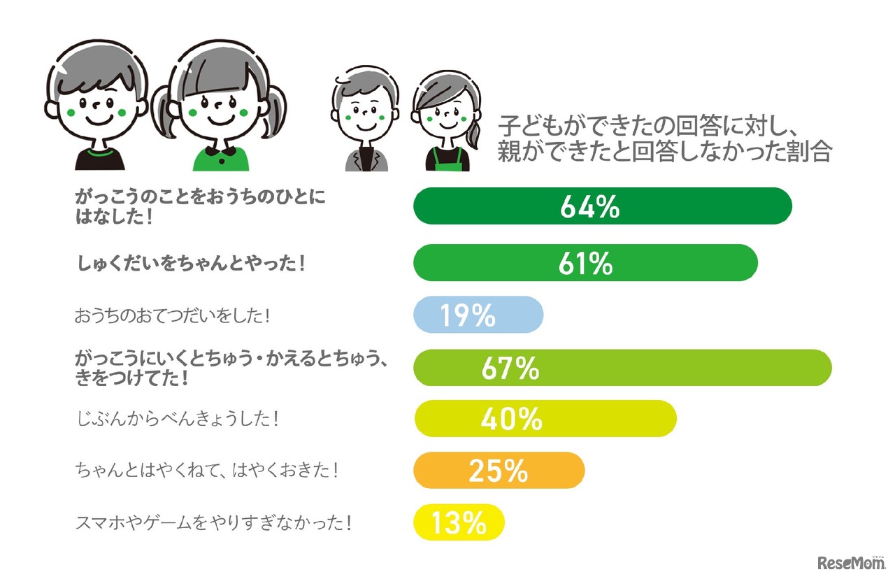 子供の「できた!」と思うこと1位は「学校のことをおうちの人に話した」で49%にのぼる一方で、「できた」と回答した子の親64%が「できていない」と評価していることが2025年5月9日、コクヨの調査結果から明らかとなった。全体では、68%の親子で評価が異なっていた。