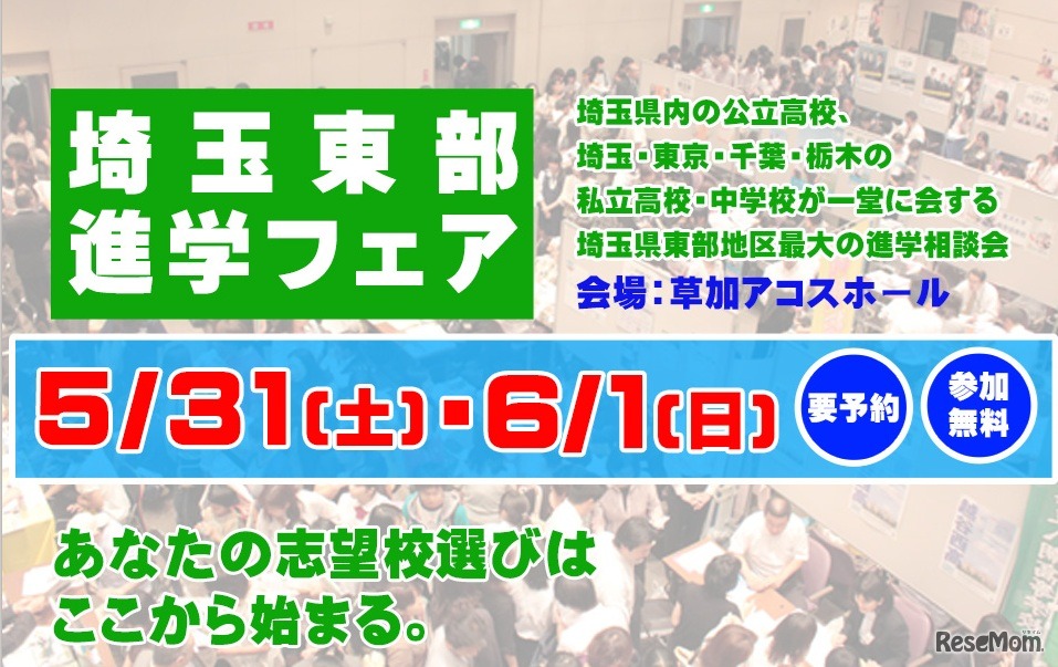 ゆめネットは2025年5月31日と6月1日、「埼玉東部進学フェア」を草加アコスホールで開催する。対象は埼玉東部地区の中学3年生と中学受験を目指す小学6年生。4つの時間帯の来場分散型で行う。参加費無料、抽選制。申込期間は5月12日から18日。抽選結果は5月22日より。