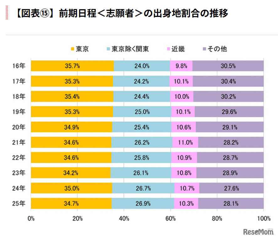 代々木ゼミナールは2025年4月、東京大学の2025年度入試データを公開した。前期日程合格者のうち、関東出身者の割合は61.7%。対照的に、近畿も含めたその他地区の割合は、この20年間で50.7%から38.3%へと9.7%も減少しているという。
