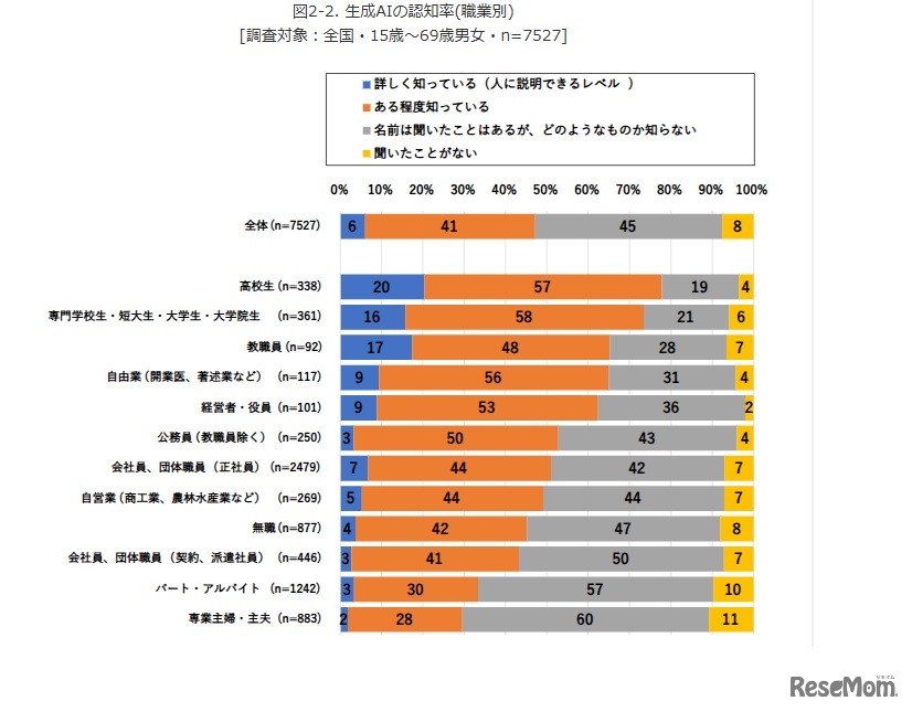NTTドコモのモバイル社会研究所は2025年5月12日、「2025年 生成AI利用意識・行動調査」の調査結果を公表した。認知率は、高校生が77%でもっとも高いことがわかった。また多くの職業で生成AIを知った時期は、2023年が最多だった。