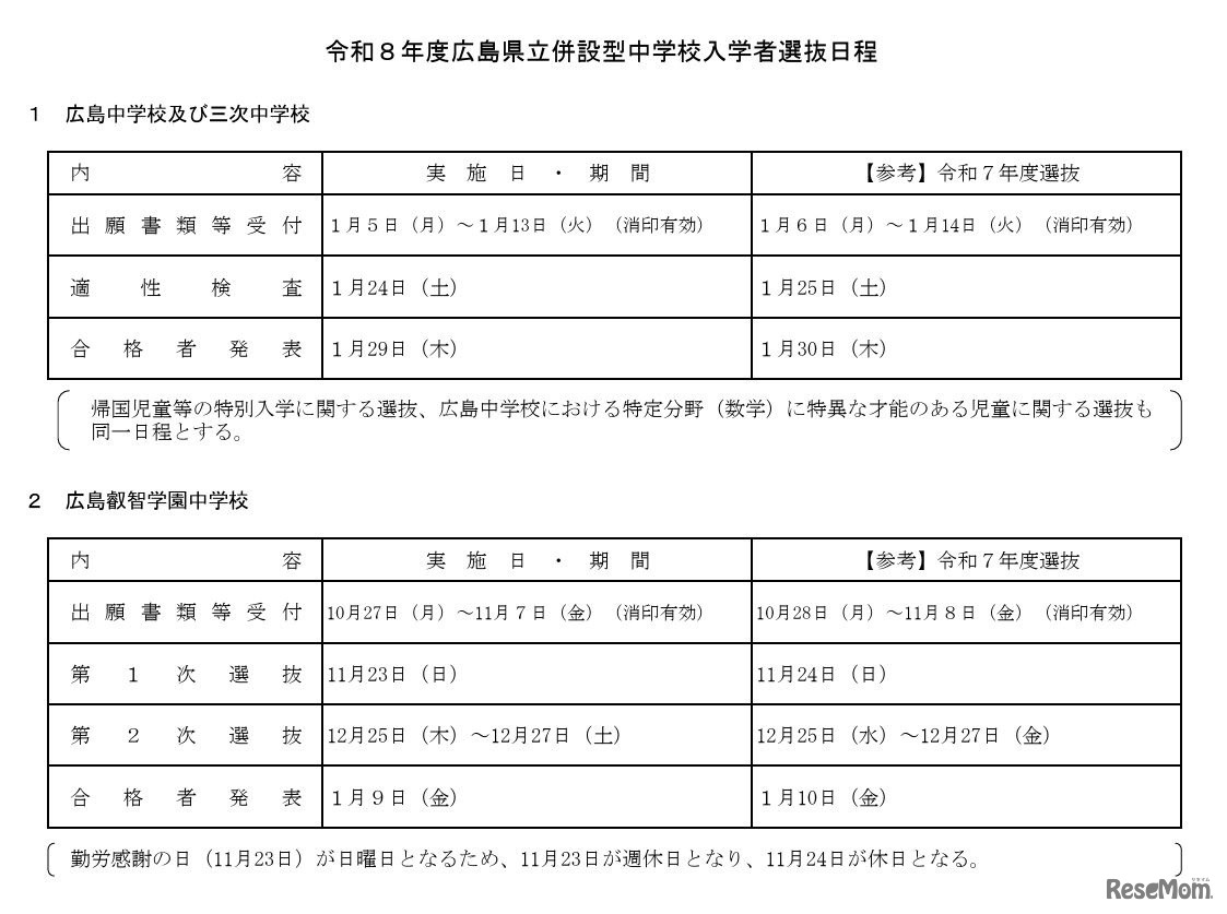 広島県教育委員会は2025年5月9日、2026年度(令和8年度)広島県公立学校の入学者選抜日程や基本方針を発表した。公立高等学校は、一次選抜の学力検査などを2026年2月25日から27日に実施し、3月9日に合格者を発表する。