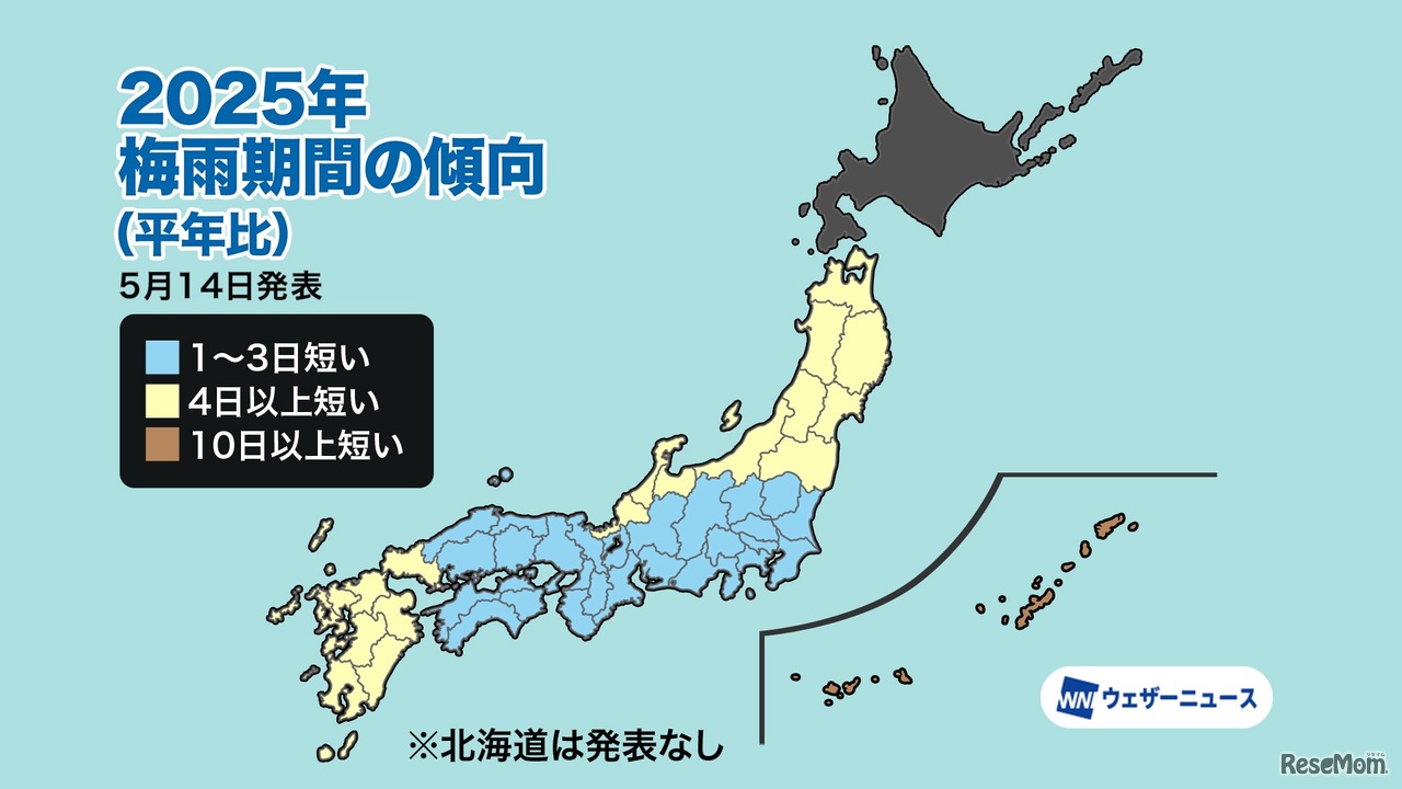 ウェザーニューズは2025年5月14日、2025年の「梅雨入り・梅雨明け見解」を発表した。沖縄・奄美の梅雨入りは平年より遅く、九州南部から東北北部は概ね平年並みとなる予想。梅雨明けは沖縄から近畿、東北南部・北部で平年より早く、東海・関東甲信・北陸では平年並みとなる見込み。
