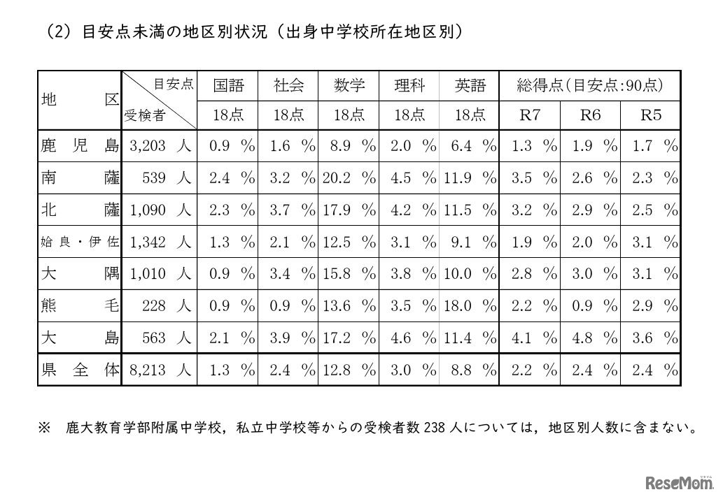画像出典:鹿児島県教育委員会「令和7年度鹿児島県公立高等学校入学者選抜学力検査結果の概要」 目安点未満の地区別状況(出身中学校所在地区別)