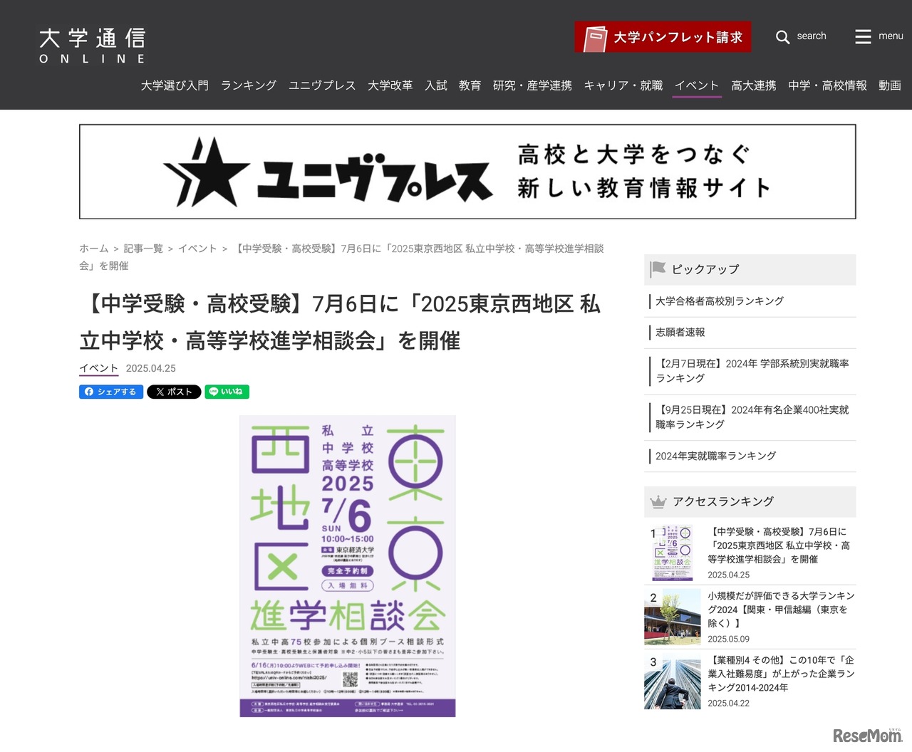 「2025年東京西地区私立中学校・高等学校進学相談会」が、2025年7月6日に東京経済大学にて開催される。東京西地区の私立中高75校が参加し、個別ブースでさまざまな相談に応じる。午前・午後の入場時間を選択する予約制。先着順で、各時間帯600組の申込みを受け付ける。予約は6月16日午前10時よりWebサイトにて受け付ける。