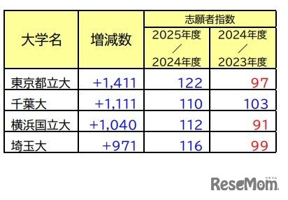 駿台予備学校は2025年5月7日、2025年度の国公立大入試状況分析を更新し、志願者数の増減が目立った大学について掲載した。もっとも増加したのは東京都立大で前年度(2024年度)より1,411人増、減少したのは鳥取大で1,191人減だった。