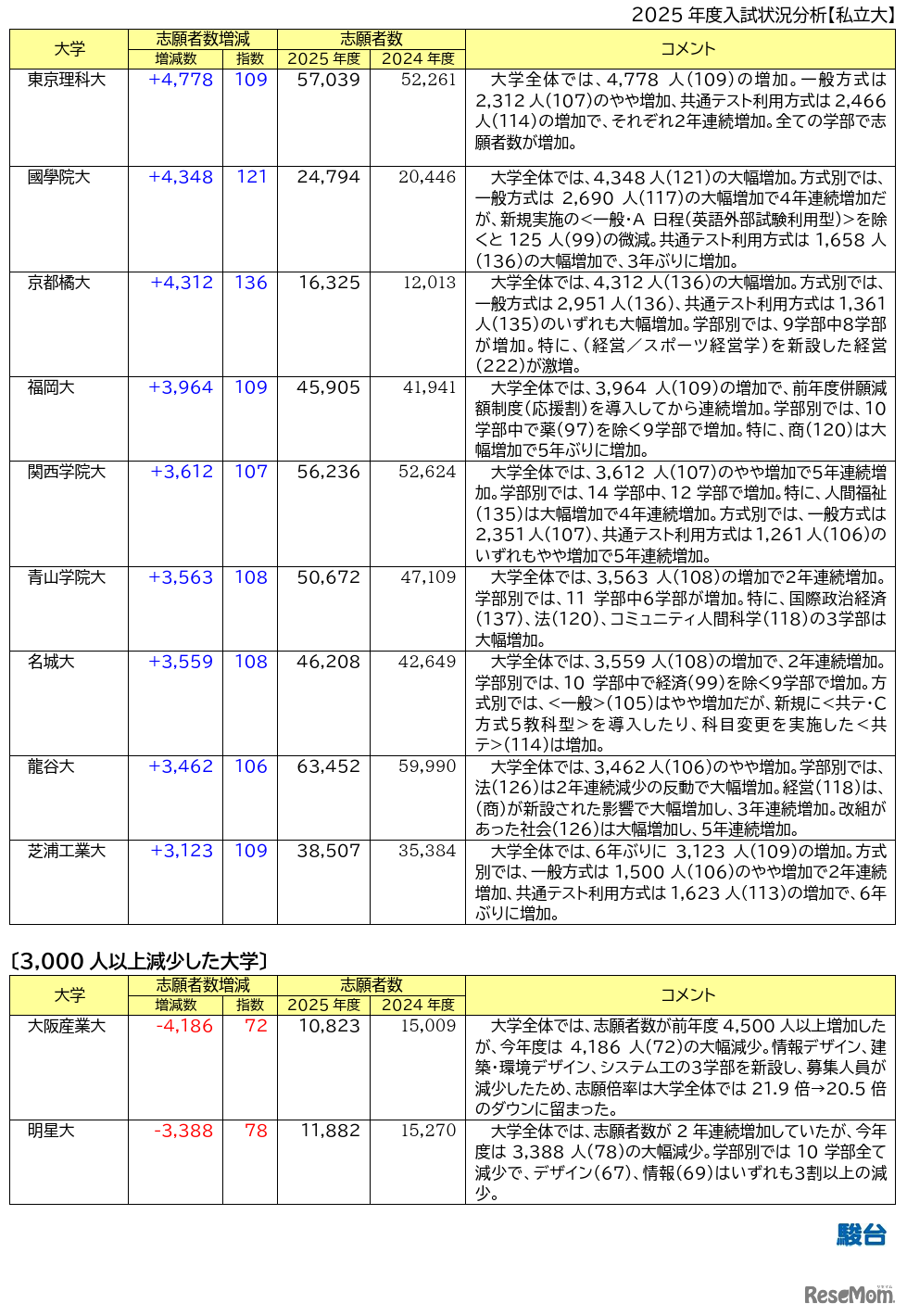 駿台予備学校は2025年5月16日、2025年度の私立大入試状況分析を更新した。共通テストの平均点アップの影響で、志願者数は共通テスト利用方式での増加が目立つ。千葉工業大や日本大、東京工科大など5大学は志願者数が1万人以上増加した。