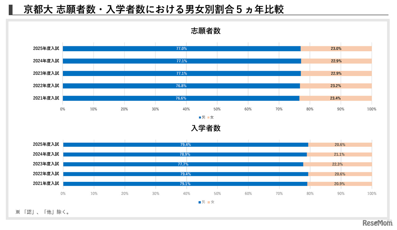 京都大学 志願者数・入学者数における男女別割合5か年比較