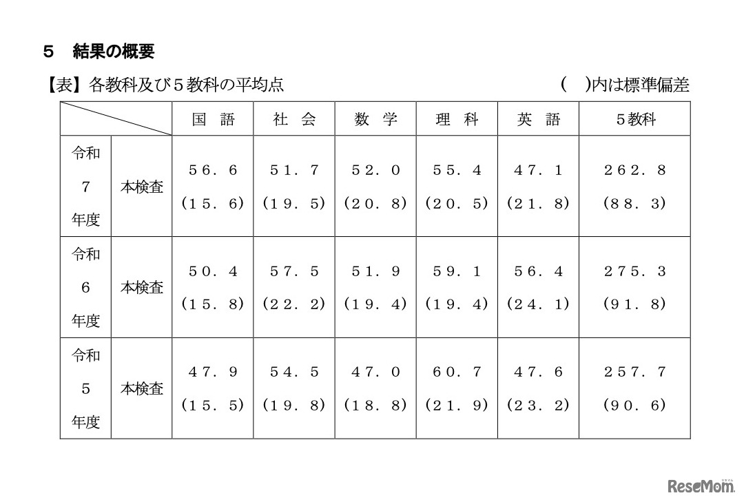 千葉県教育委員会は2025年5月27日、2025年度(令和7年度)千馬県公立高等学校入学者選抜の検査について公表した。各選抜の募集人員、志願者数、入学許可候補者数を掲載しているほか、学力検査結果の概要をまとめた資料を公表。2025年度の5教科の平均点合計は262.8点で、前年度に比べ12.5点減少した。