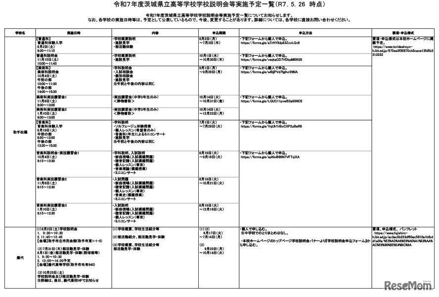 令和7年度茨城県立高等学校学校説明会等実施予定一覧(2025年5月26日時点)