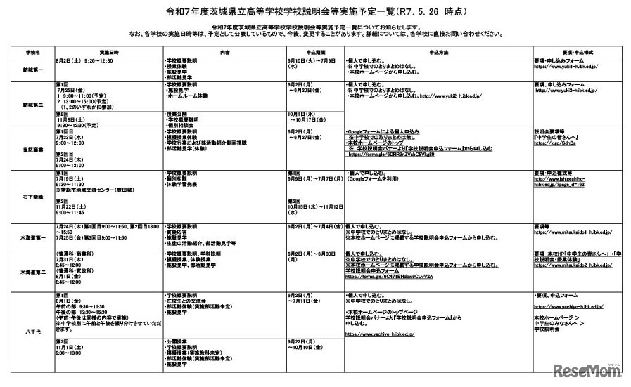 令和7年度茨城県立高等学校学校説明会等実施予定一覧(2025年5月26日時点)