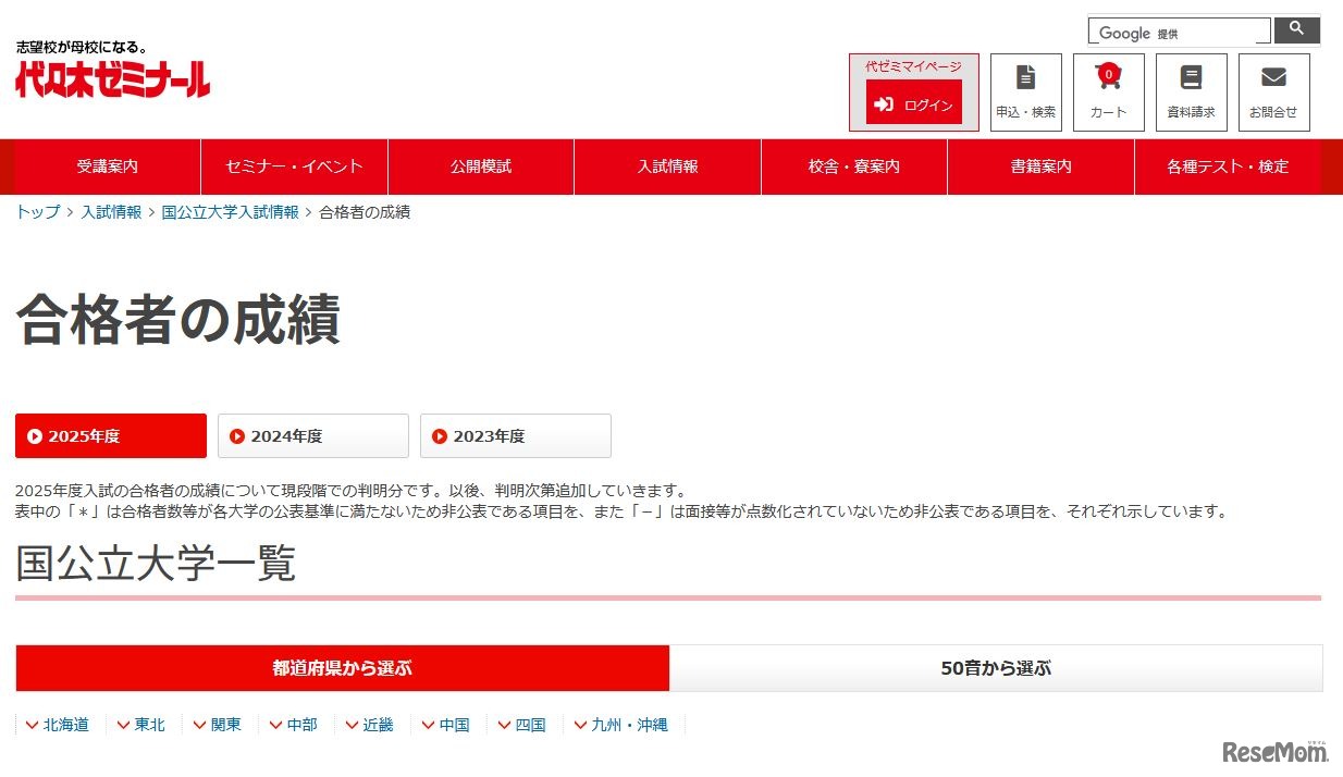 代々木ゼミナールは2025年5月28日、2025年度入試の国公立大学合格者の成績について、判明した分を追加して最新情報に更新した。国公立大学合格者の最高点・最低点・平均点が学部・学科等別に確認できる。