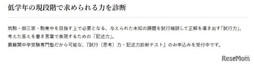 2025年6月から7月にかけて、Z会エクタス栄光ゼミナールは、筑駒・御三家・駒東中を目指す小学1~3年生を対象に「試行(思考)力・記述力 診断テスト」を開催する。最難関中学合格に必要な力を低学年の段階で診断し、強みと弱みを客観的に分析することを目的としている。