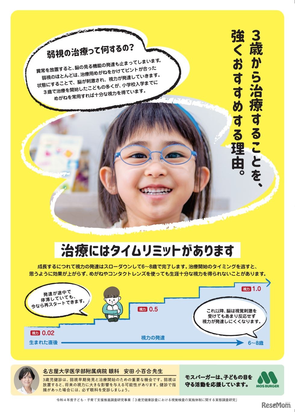 モスバーガーを展開するモスフードサービスは、2025年6月10日から全国のモスバーガー店舗(一部店舗除く)にて、お子様向けセット「モスワイワイセット」や「低アレルゲンメニュー」を注文した人を対象に、弱視早期発見に関する啓発リーフレットをプレゼントする。
