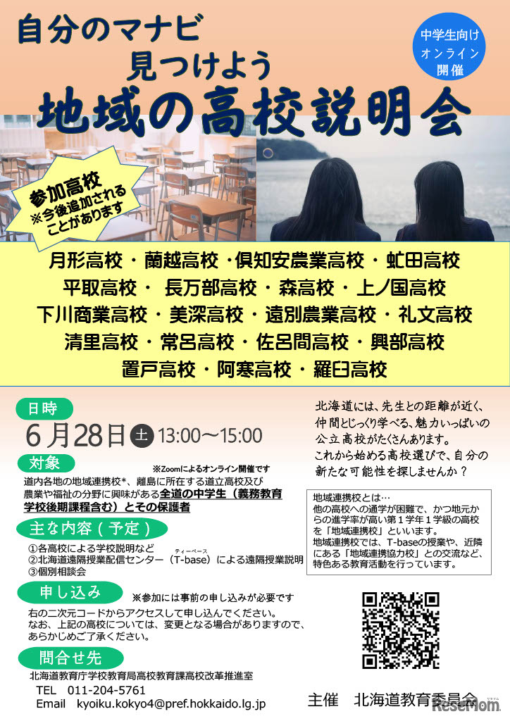 北海道教育委員会は2025年6月28日、道内の地域連携校や離島の道立高校の特色・魅力を紹介する「地域の高校説明会」をオンラインで開催する。対象は全道の中学生(義務教育学校後期課程含む)とその保護者。申込みは6月20日まで、専用申込フォームより受け付ける。