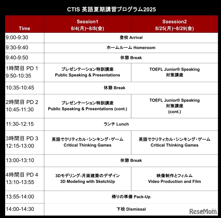 2025年8月、キャピタル東京インターナショナルスクール(CTIS)は、英語夏期講習プログラムを開催する。プログラムは2つのセッションに分かれており、セッション1は8月4日から8月8日、セッション2は8月25日から8月29日までの5日間。対象は小学6年生から中学2年生、CTIS生以外の参加も可能。