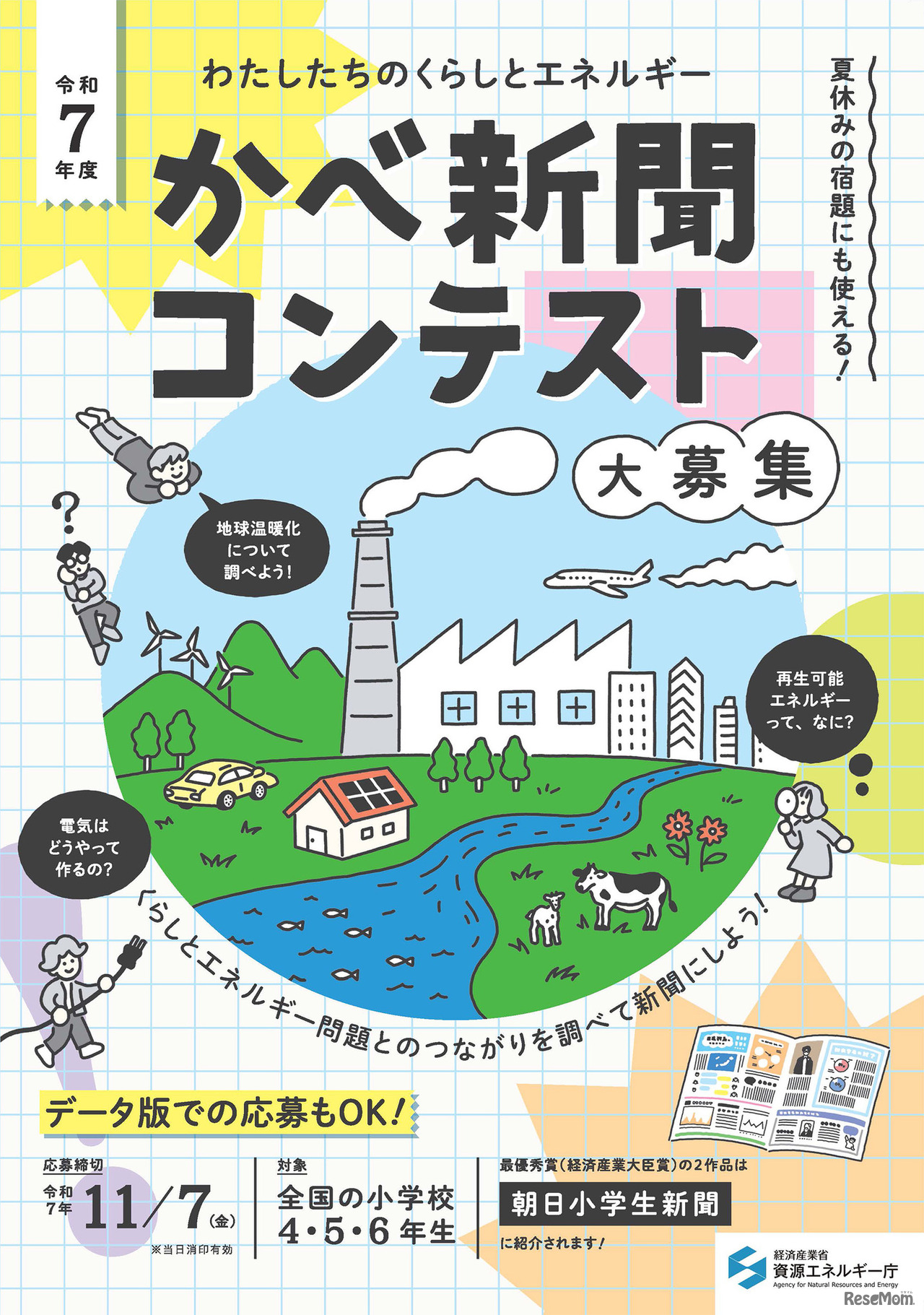 経済産業省資源エネルギー庁は、全国の小学4~6年生を対象とした、2025年度(令和7年度)「かべ新聞コンテスト」の作品募集を開始した。テーマは「わたしたちのくらしとエネルギー」。募集期間は2025年11月7日まで。参加は学校単位・グループ・個人いずれも可能で、応募は無料。A2サイズの紙作品のほか、データ版での応募も受け付ける。