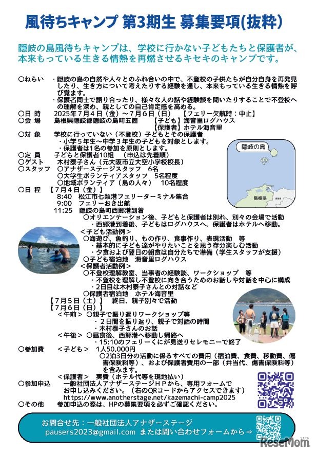 アナザーステージは、2025年7月4日から6日までの3日間、島根県隠岐の島で「風待ちキャンプ2025」を開催する。このキャンプは、不登校の子供とその保護者を対象としており、親子での参加が求められる。
