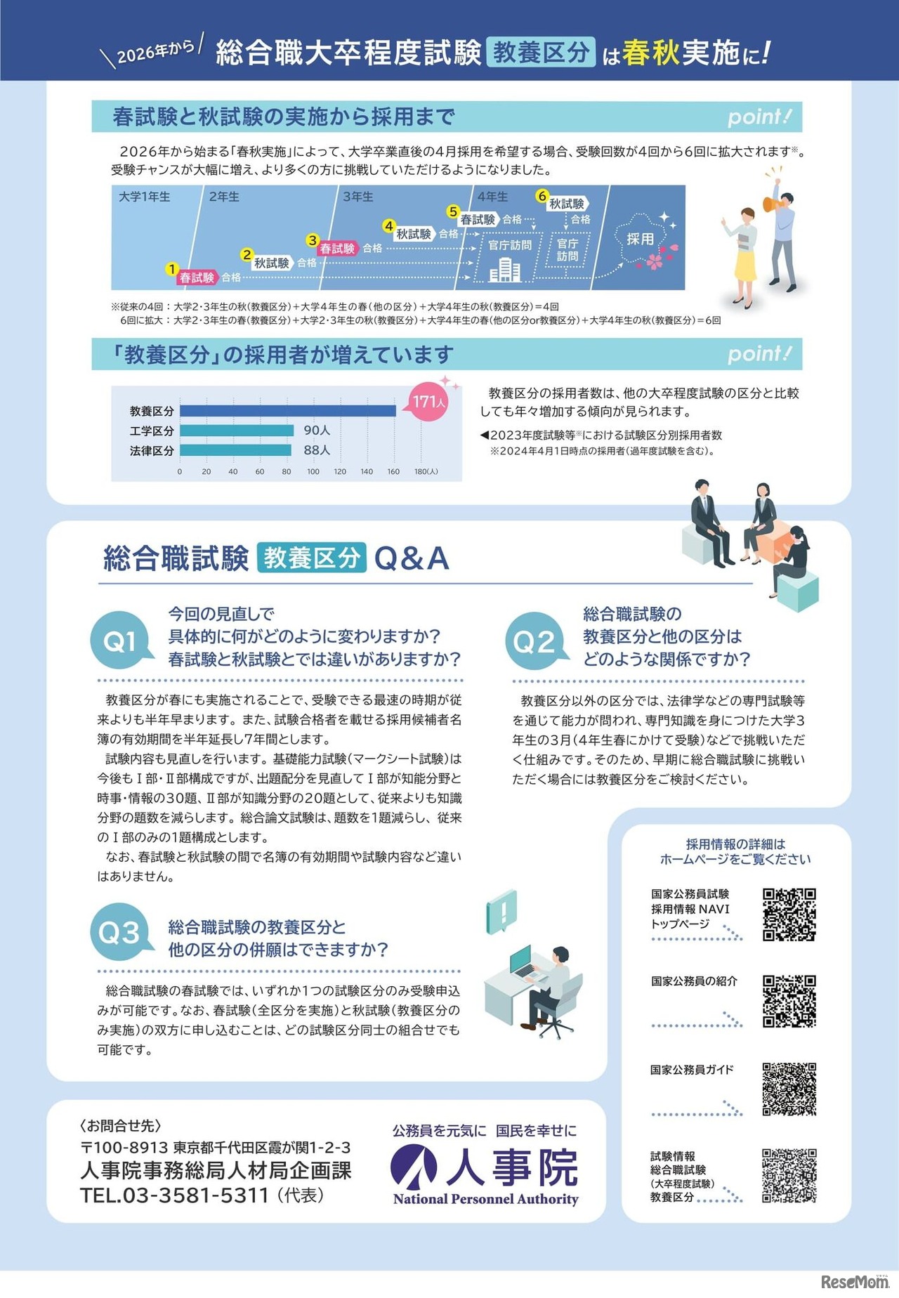 人事院は2025年6月9日、2026年度春の国家公務員総合職試験(大卒程度試験)より「教養区分」を設置することを発表した。これまでより半年早く、19歳(大学2年生)春から「教養区分」を受験でき、春と秋をあわせると大学4年生までの間に最大6回受験可能となる。