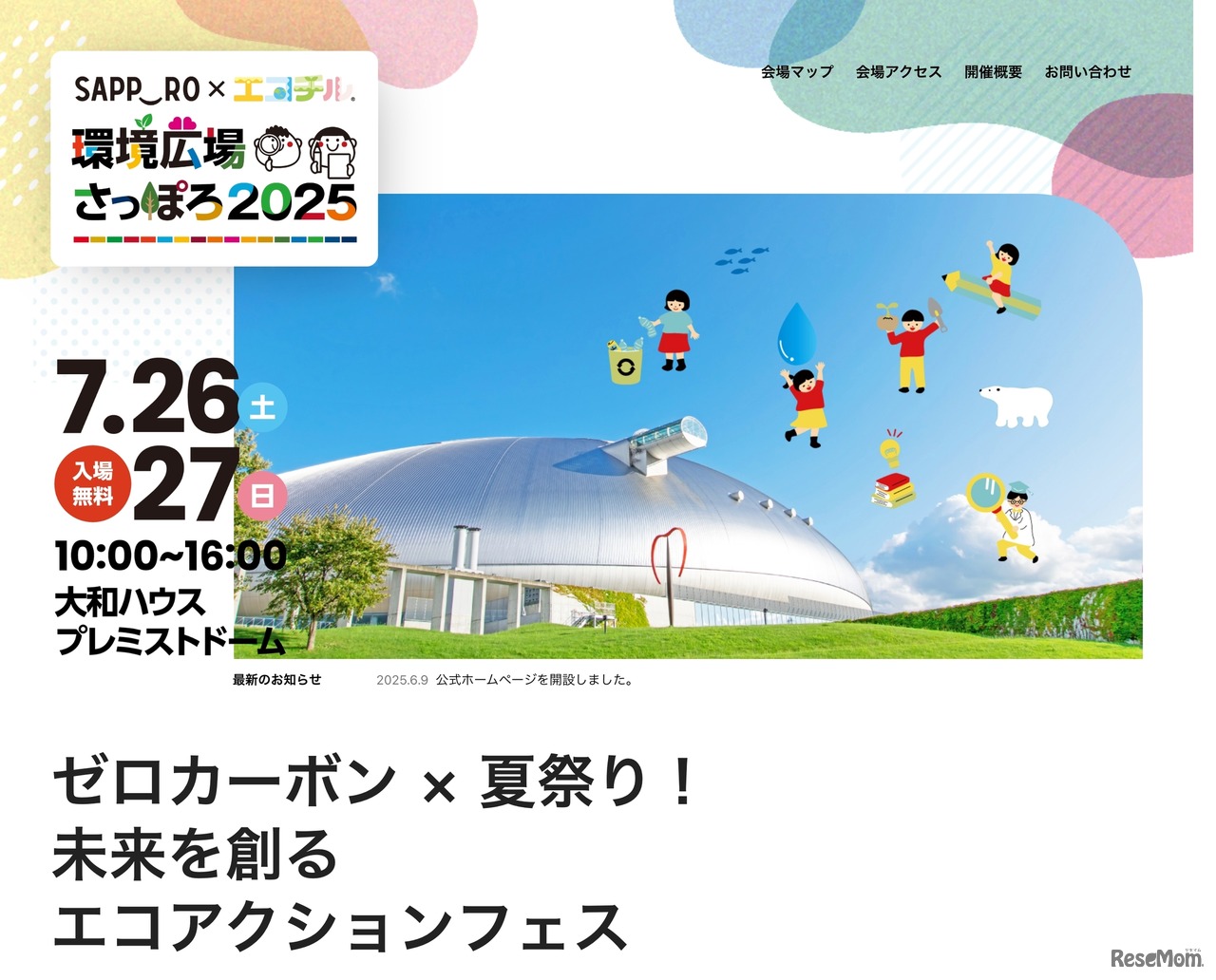 北海道最大級の環境・SDGsイベント「環境広場さっぽろ2025」が2025年7月26日・27日、大和ハウス プレミストドーム(札幌ドーム)で開催される。2025年は、「ゼロカーボン×夏祭り!未来を創るエコアクションフェス」をテーマに、多数の体験型ブースを展開。入場無料。