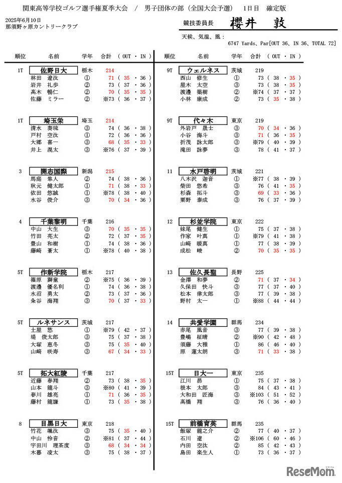 画像出典:関東高等学校・中学校ゴルフ連盟 関東高等学校ゴルフ選手権夏季大会/男子団体の部(全国大会予選)1日目