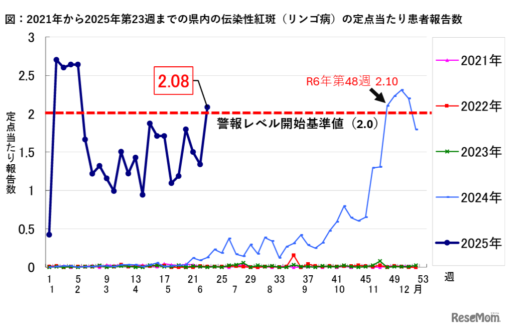 伝染性紅斑(リンゴ病)の報告数が全国的に急増している。千葉県は2025年6月11日、第23週(6月2日~8日)の定点あたり報告数が2.08人と、国の定める警報基準値2人を上回ったと発表。幼児や学童期の子供だけでなく、妊娠中や妊娠の可能性のある人にも注意を呼び掛けている。