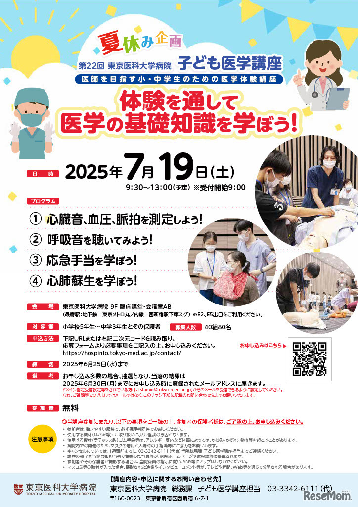 東京医科大学病院は2025年7月19日、小学校5年生~中学3年生とその保護者を対象に、体験を通して医学の基礎知識を学べる夏休み企画「子ども医学講座」を開催する。参加費無料、申込締切は6月25日。