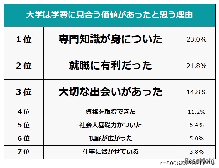 大卒者の71.2%が、大学は学費に見合う価値があると感じていることが2025年6月10日、ビズヒッツの調査で明らかになった。理由1位は「専門知識が身についた」、2位は「就職に有利だった」、3位は「大切な出会いがあった」。